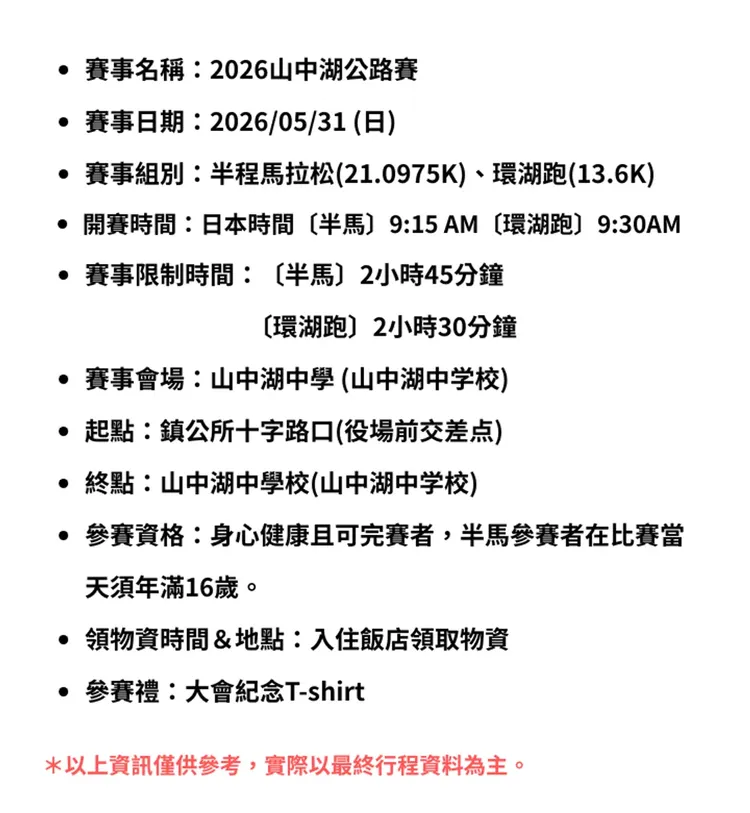 - 開賽時間:日本時間〔半馬〕9:15 AM〔環湖跑〕9:30AM