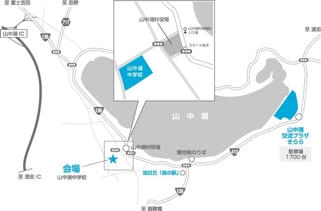 步行約22分鐘(1.5公里)即可抵達賽事會場(山中湖中學 (山中湖中学校))。
