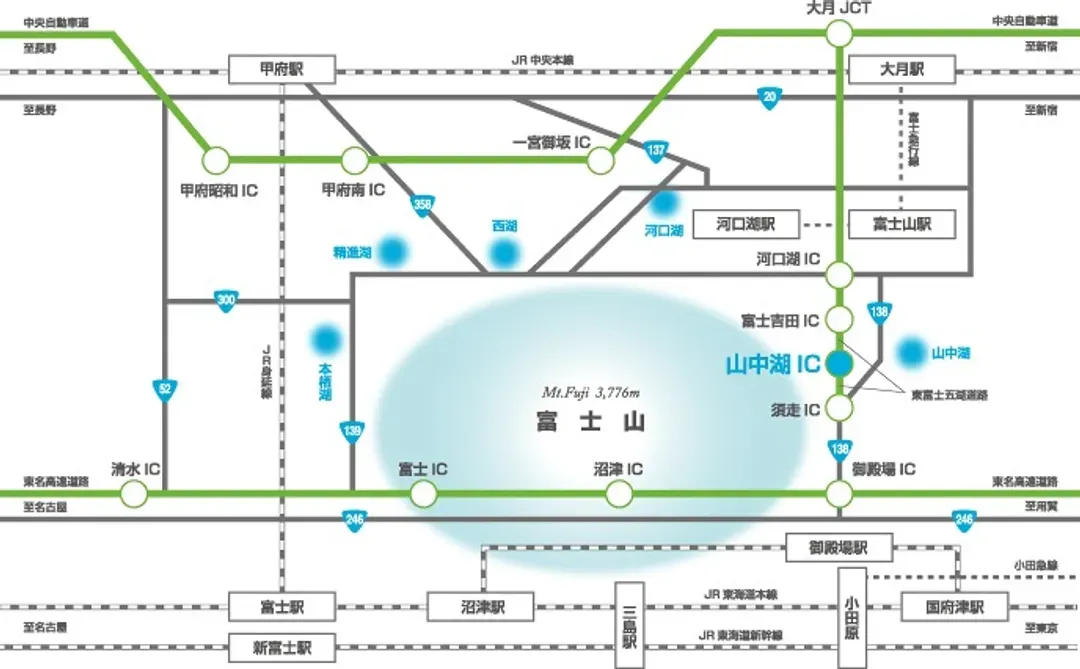 - 地鐵:JR中央線新宿站乘搭「快速急行 小田原」列車至「新松田站」,轉乘御殿場線至「御殿場站」下車,需再轉乘公車往河口湖方向,於「山中湖郵便局入口」下車,,再步行約1分鐘,即可抵達飯店。