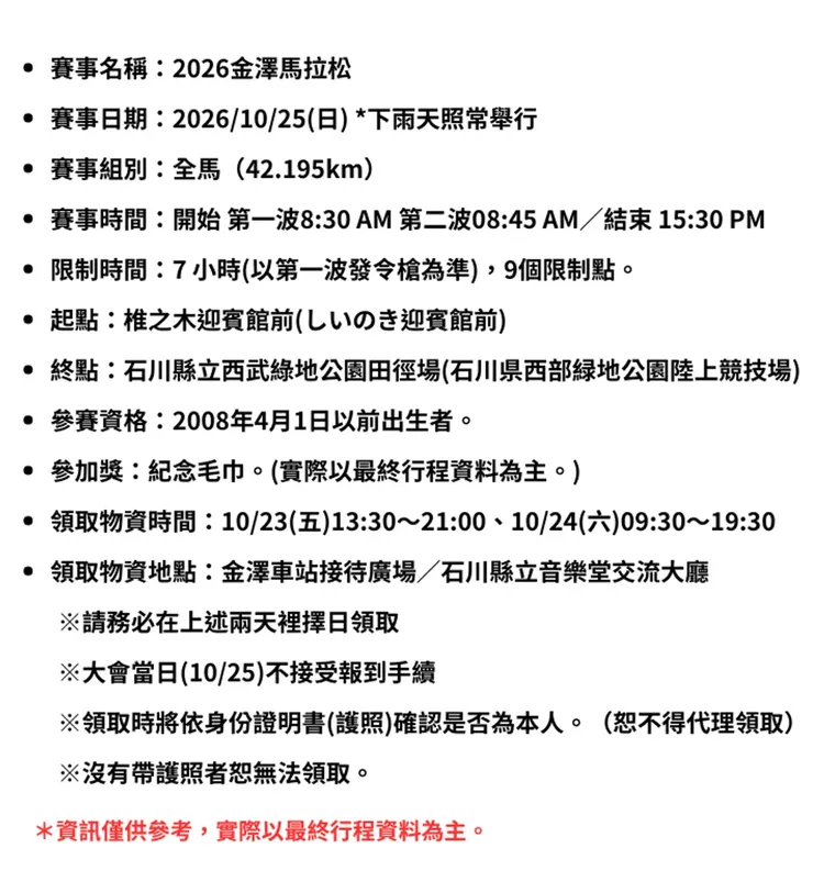 ▶ 參加【2026金澤馬拉松】參賽權+超值精選2晚住宿需要準備什麼?