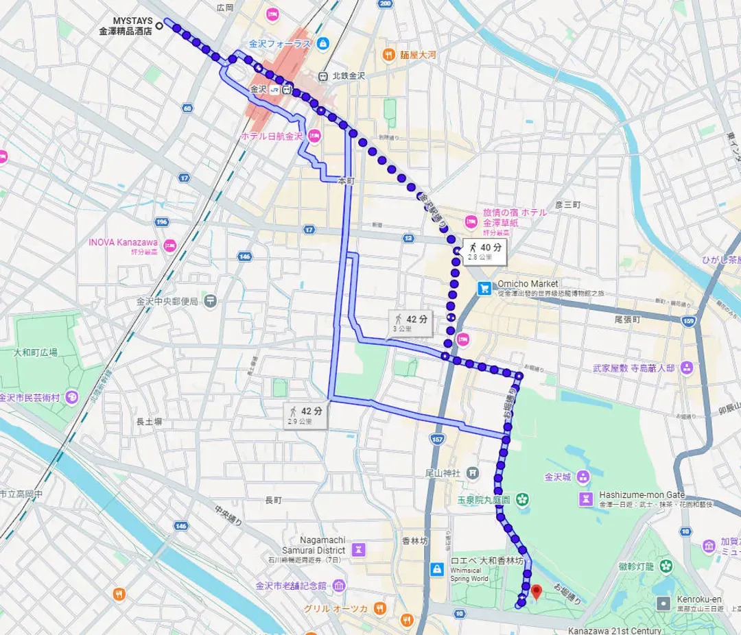 ■ 金澤Mystays Premier飯店(Hotel Mystays Premier Kanazawa)➡️賽事起點(椎之木迎賓館前(しいのき迎賓館前))