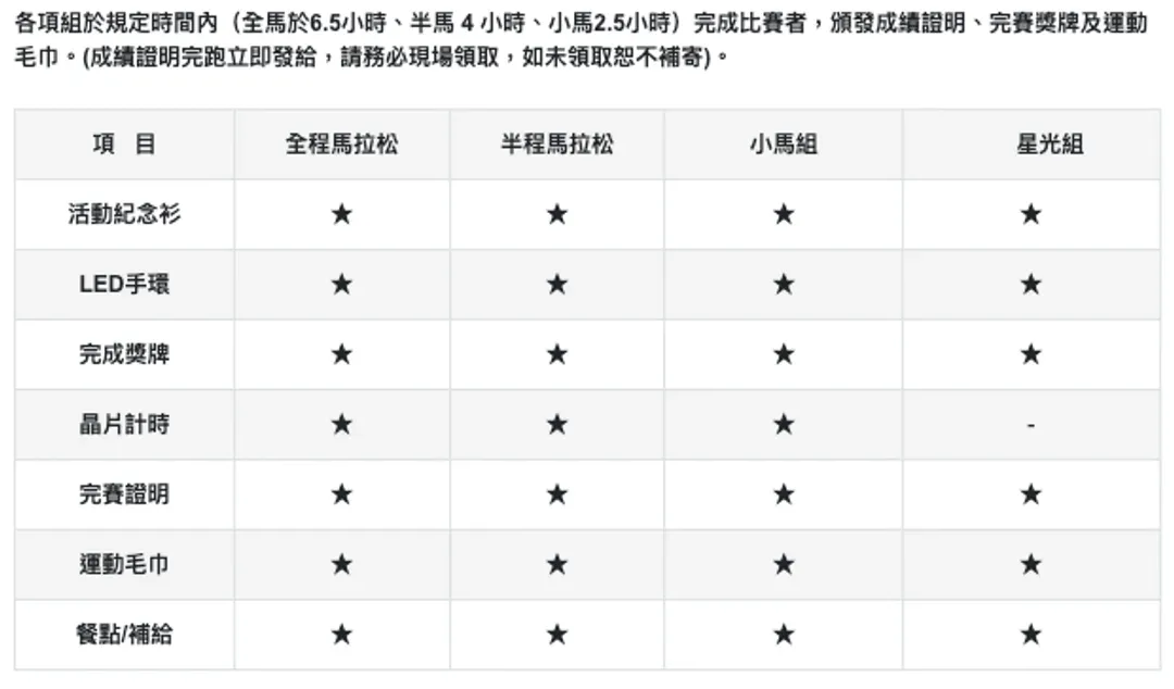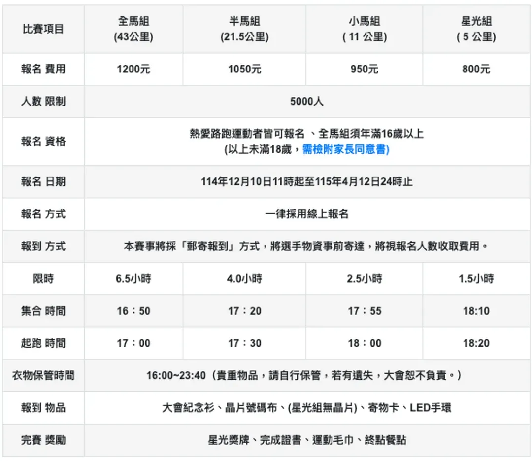 | 2026台北星光馬拉松 | 全馬組 (43K)、半馬組 (21.5K)、小馬組 (11K)、星光組 (5K) | 2026/05/16 (六) | 全馬組 (17:00)、半馬組 (17:30)、小馬組 (18:00)、星光組 (18:20) | 參賽權+1晚住宿 |