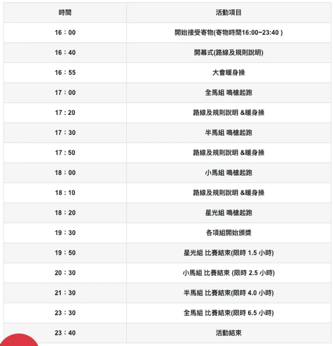 - 參賽選手無法於規定時間內跑完全程者,中途必須自行設法返回終點或與大會聯絡人聯繫。