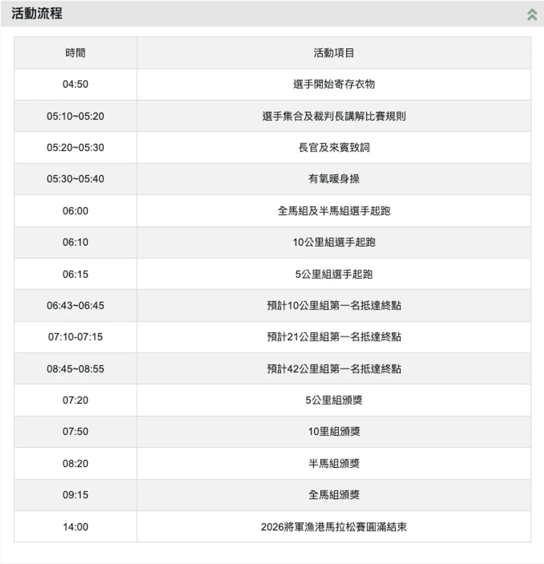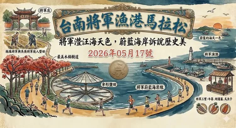 | 2026將軍漁港馬拉松 | 全馬組(42K)、半馬組(21K)、10公里組、5公里組 | 2026/05/17 (日) | 全馬組(6:00)、半馬組(6:00)、10K(6:10)、5K(6:15) | 參賽權+1晚住宿 |