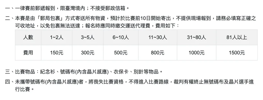 - 包含大會參賽物資(如:號碼布、感應晶片、紀念衫等,依大會公告為準)之郵寄運費及AsiaYo 人工代報名處理費。