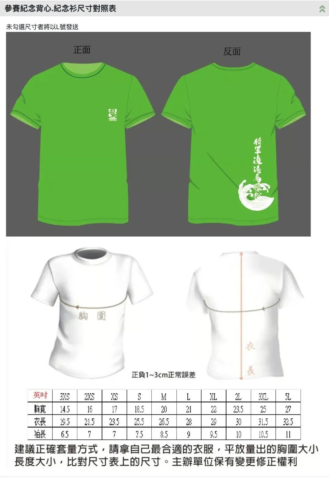 【參賽紀念背心.紀念衫尺寸對照表】