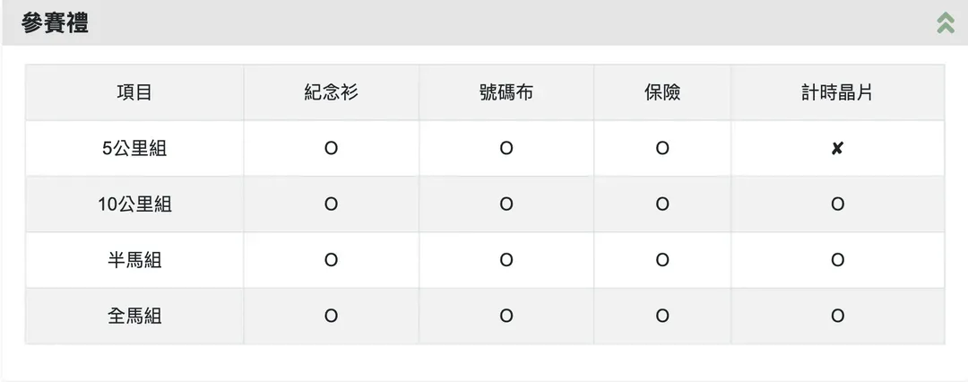 | 2026台北星光馬拉松 | 全馬組 (43K)、半馬組 (21.5K)、小馬組 (11K)、星光組 (5K) | 2026/05/16 (六) | 全馬組 (17:00)、半馬組 (17:30)、小馬組 (18:00)、星光組 (18:20) | 參賽權+1晚住宿 |
