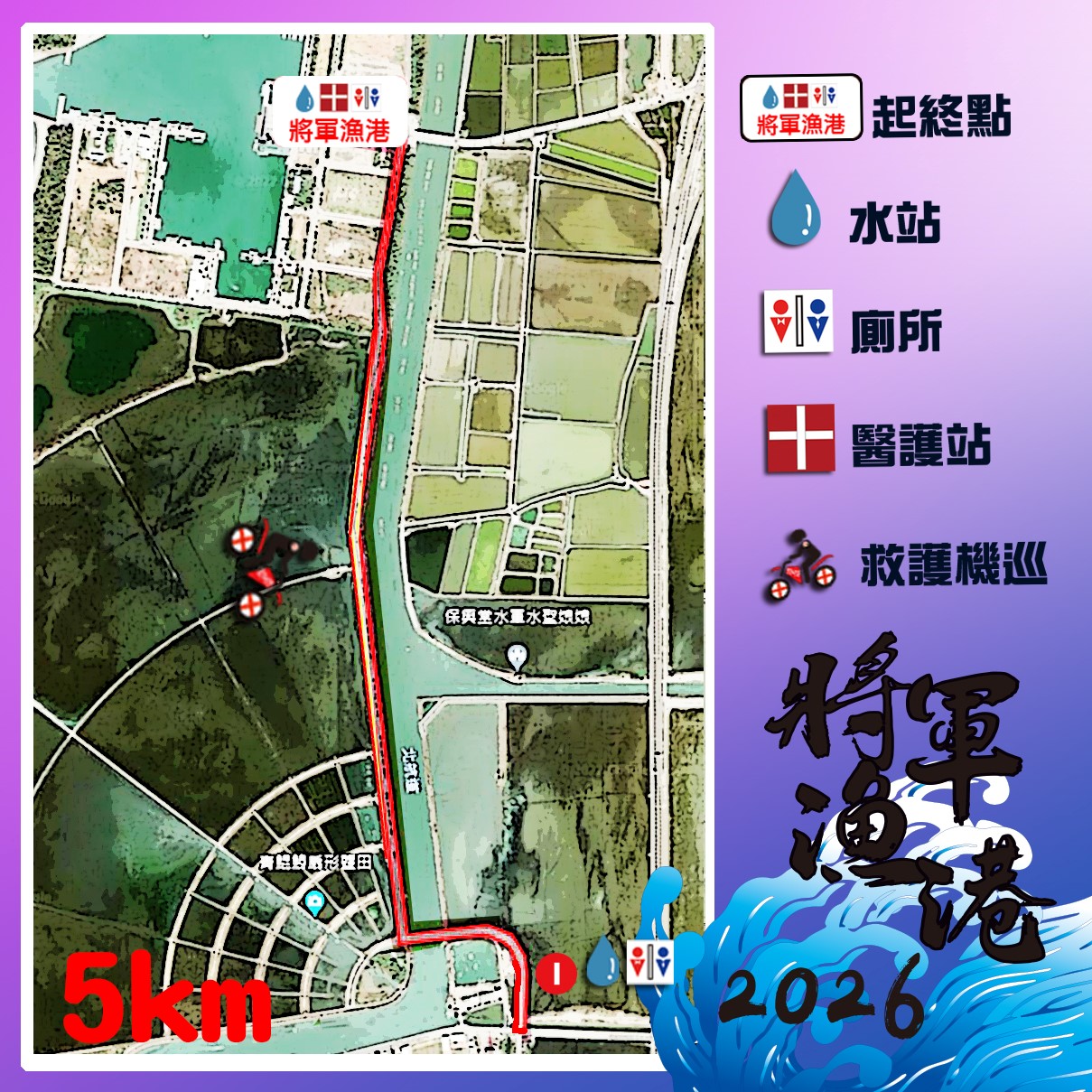 - 將軍漁港→直走→右轉南25→北航道河濱公園→扇形鹽田→左轉鹽豐橋→南25.4右轉2.5K/M折返左轉25.4→鹽豐橋右轉→扇形鹽田→北航道河濱公園左轉將軍漁港5K/M終點。