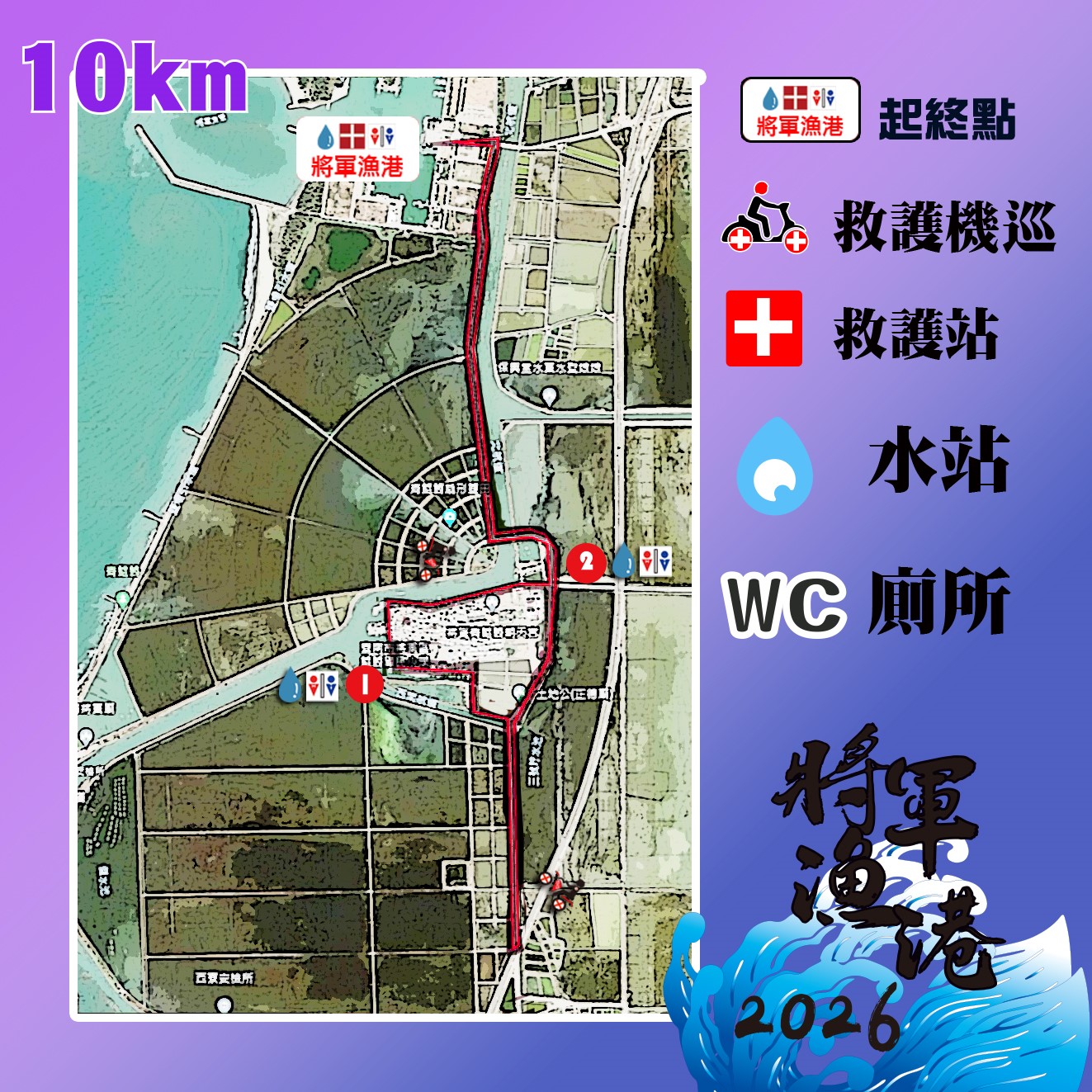 - 包含「2026 將軍漁港馬拉松」所選組別(全馬組/半馬組/10公里組/5公里組)之報名費。