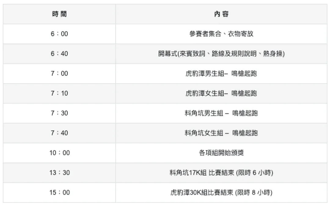 公里數: 30 公里(虎豹潭挑戰組)、17 公里(料角坑體驗組)