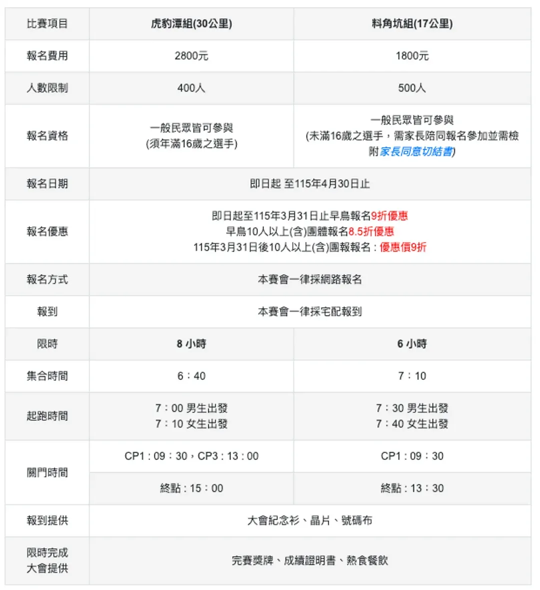 - 包含 「2026 第十屆虎豹雙棲越野挑戰賽」 所選組別(30K 虎豹潭挑戰組 / 17K 料角坑體驗組)之報名費。