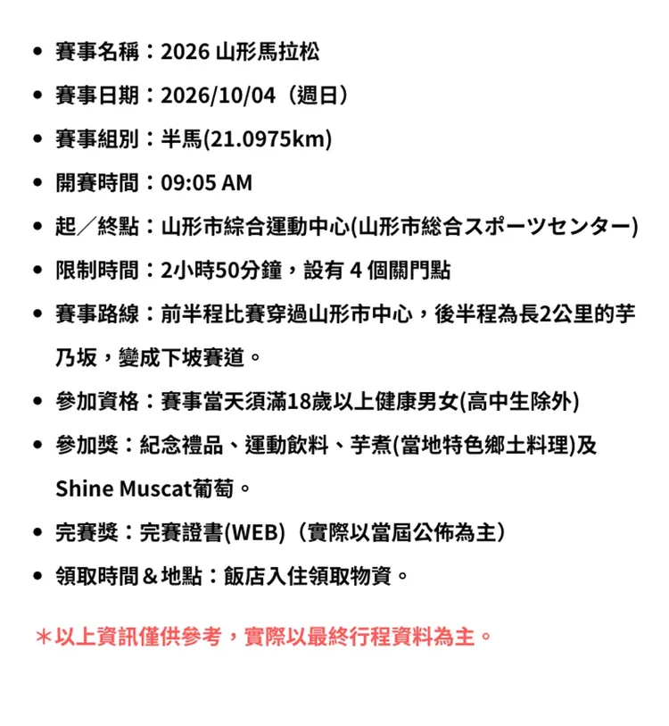 ▶ 參加【2026山形馬拉松】參賽權+超值精選2晚住宿需要準備什麼?
