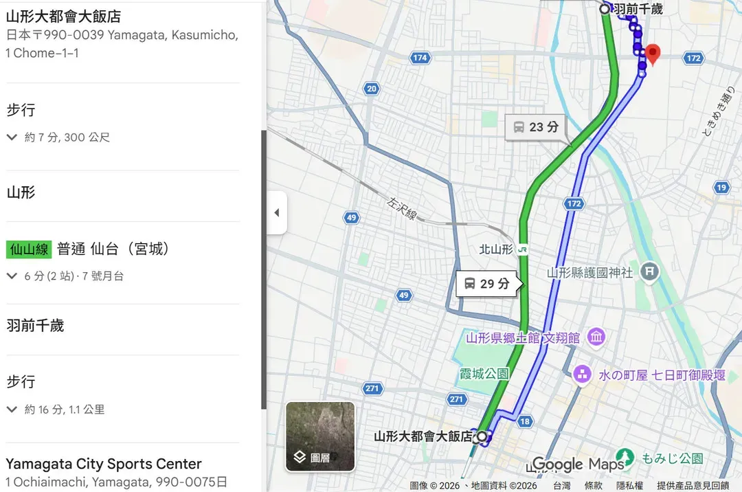 山形大都會飯店-南館(Hotel Metropolitan Yamagata)↔️賽事會場 (山形市綜合運動中心 ( Yamagata City General Sports Center / 山形市総合スポーツセンター ))