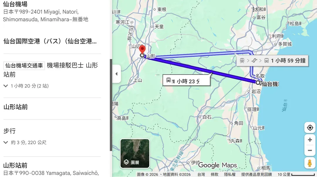 - 搭乘 仙台機場聯通捷運線 至「仙台站」,轉乘 公車🚌仙台~山形(搭乘時間約1小時7分鐘),即可抵達「山形駅前」。