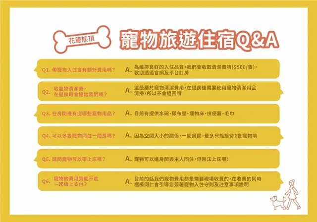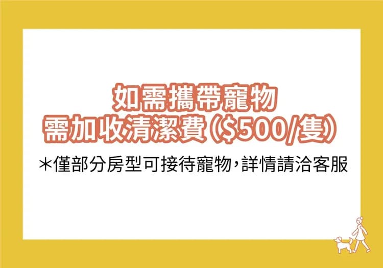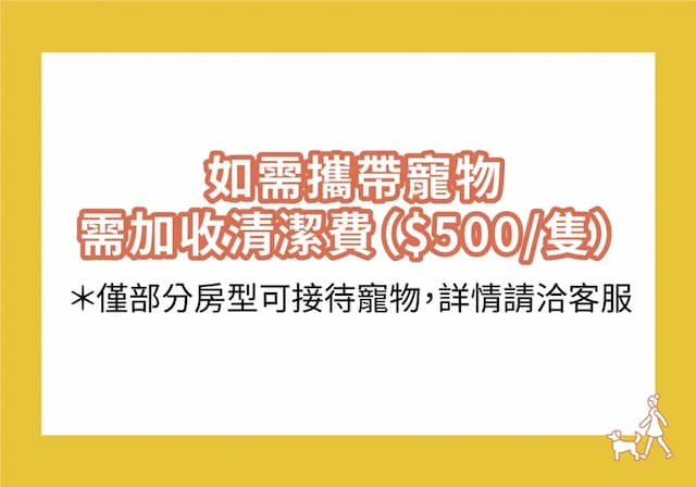 住宿注意事項1.入住時間:16:00-20:00,退房時間:11:00 AM*中午12點過後可寄放行李,若較晚抵達,請務必最晚於入住當日晚上6點前來電聯繫告知, 避免無法接待。*2.無提供早餐及接駁服務3.僅提供部分房型接待寵物,如有需求請電話洽詢預訂(需額外收取清潔費500元/隻),恕不接受於平台訂房。4.民宿無附設停車位。5.如需修改/取消訂單,請在您的免費取消期限內連繫您當初預定的平台,避免產生額外的取消費用。6.有附設電梯7.室內全面禁菸,違者依菸害防制法處2000 - 10000元罰鍰。