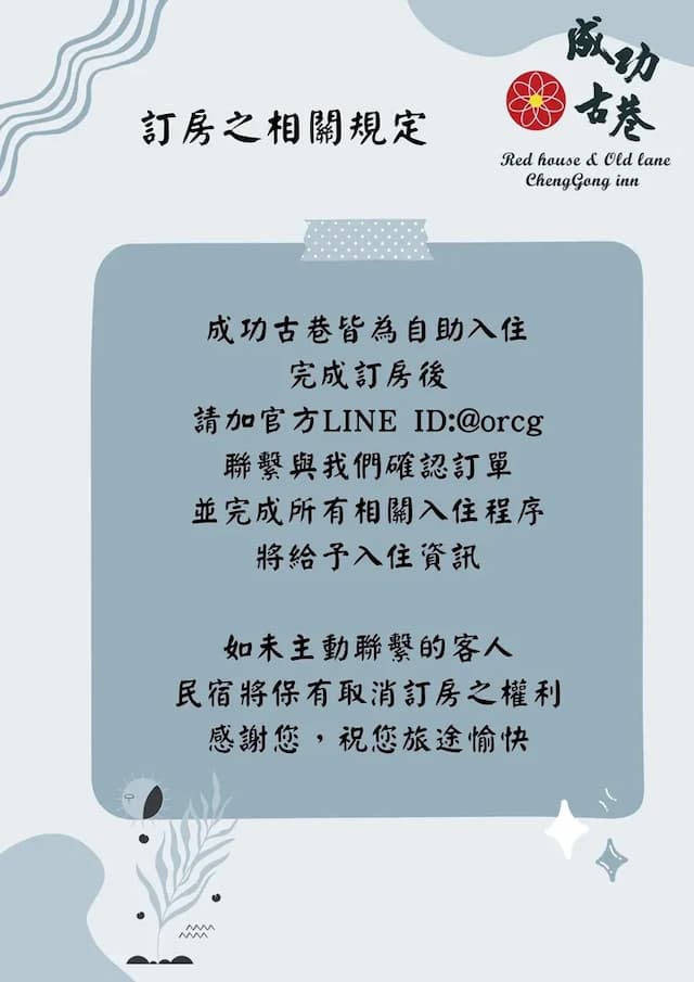 成功古巷|近赤崁樓|可選購6人包棟 的入住時間為 15:00、退房時間為 11:00,請配合入住/退房時間以享受最佳住宿體驗。