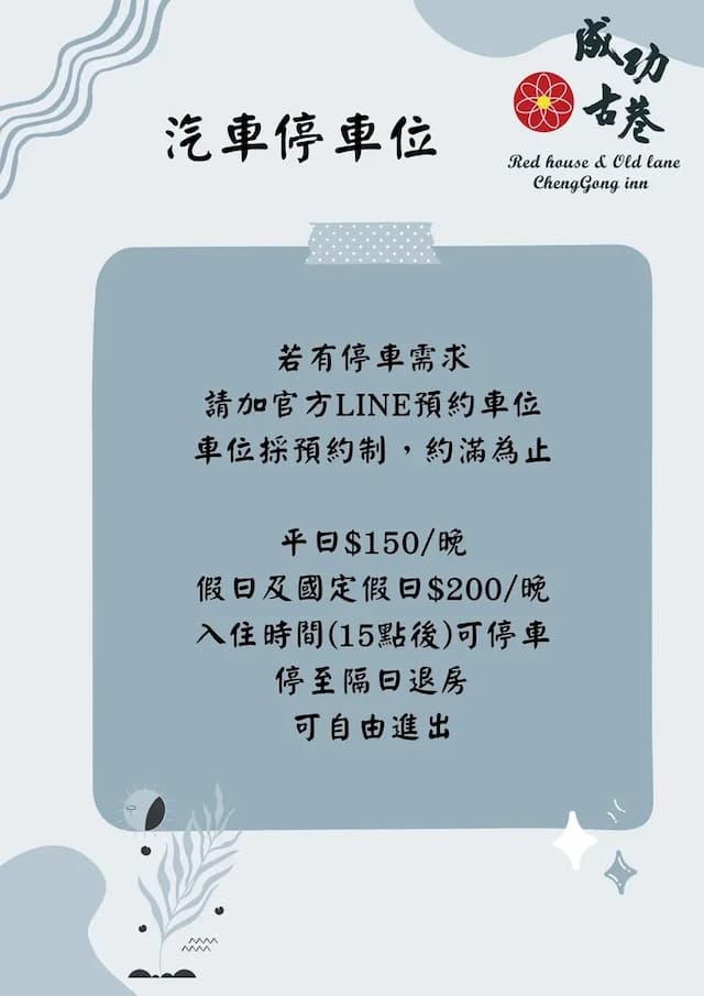 來到 台南市 自駕遊,選擇入住 成功古巷|近赤崁樓|可選購6人包棟 可先參考旅宿頁面的「服務與設施」、查看「交通服務/設施」項目,了解 成功古巷|近赤崁樓|可選購6人包棟 是否有提供免費/付費停車場、周邊是否有其他停車場等相關交通服務資訊。若「服務與設施」項目中未顯示,表示未提供此服務。