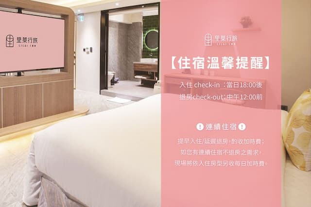 里萊行旅-桃園館 的入住時間為 18:00、退房時間為 12:00,請配合入住/退房時間以享受最佳住宿體驗。
